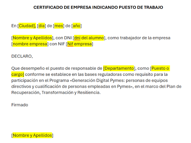El único requisito es acreditar, mediante declaración responsable o certificado de empresa, que desempeñas funciones directivas en una pyme, ya sea con responsabilidad total o en un área o departamento específico.
